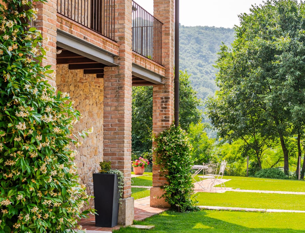 The main residence unfolds across two floors and a vaulted cantina, offering four bedrooms and five bathrooms in a layout designed for both privacy and conviviality. Light flows in through generous windows, framing views over manicured gardens, an ancient olive grove and the distant folds of the Berici hills.